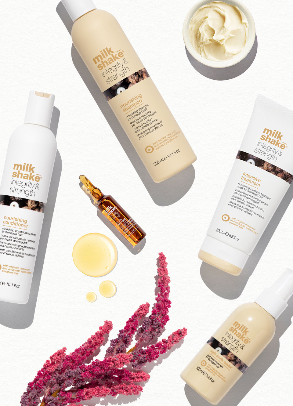 Amaranth seed extract, ORGANIC Murumuru butter, hydrolyzed keratin.