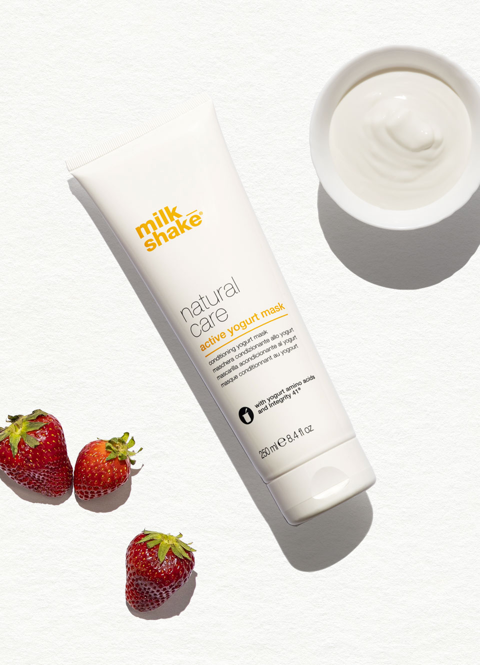 Una mascarilla rica a base de aminoácidos de yogur, aceites de arroz y aguacate, agentes hidratantes, vitamina E e Integrity 41® nutre y acondiciona el cabello natural o coloreado.