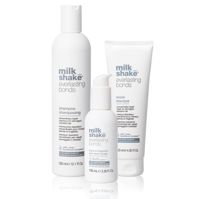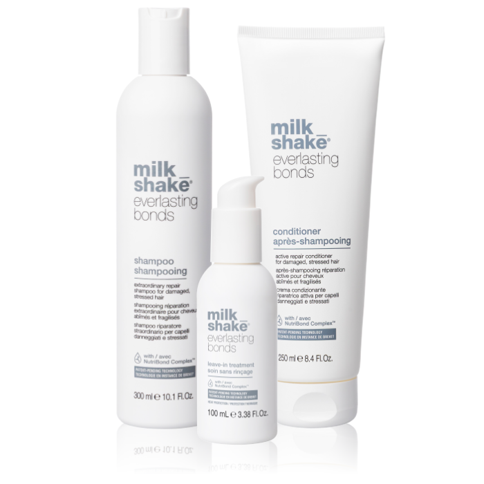 - *Test strumentale ex-vivo dopo 5 applicazioni di milk_shake® Everlasting Bonds shampoo e conditioner (tempo di posa: 10 minuti).